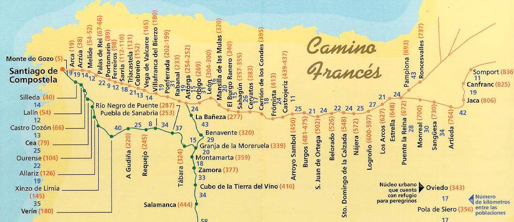 Durante a peregrinação, você encontrará placas, marcos e sinais informativos ao longo das rotas. Essas informações ajudam os peregrinos a se orientar e a acompanhar o progresso na jornada. Em geral, as setas amarelas e sinais ao logo do Caminho são mais que suficientes para encaminhar os peregrinos pelas rotas, principalmente no Caminho Francês.